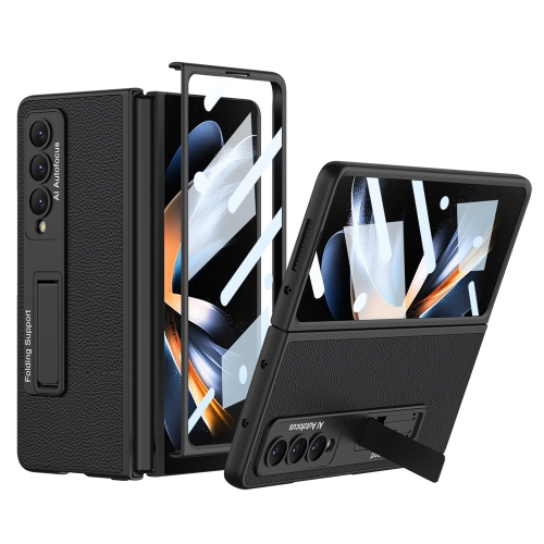 Suitable for Samsung Z fold4 folding screen mobile phone case leather plain leather bracket PC hard shell anti-fall case - [shell film] cool black