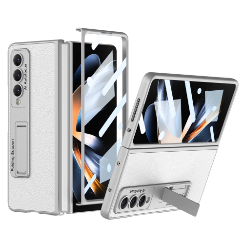 Suitable for Samsung Z fold4 folding screen mobile phone case leather plain leather bracket PC hard shell anti-fall shell - [shell film] temperament silver