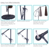 Outdoor patio offset umbrella with cross base and cantilever crank. Features polyester umbrella fabric, powder-coated steel ribs and pole. Requires 4 heavy 30 lb bases to counterbalance. Dimensions: 2" diameter pole x 95" H x 135" W with a 115" diameter canopy; weighs 28 lbs