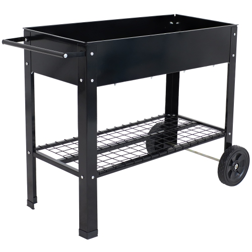 Raised garden planter cart with storage shelf. Steel with black galvanized finish. Includes 1 raised garden cart. Store other plants or gardening supplies on the lower shelf. Wheels and handlebar make the cart mobile and easy to use. 43.5" L x 20.75" W x 31.75" H; 29 lbs; Weight capacity: 175 lbs
