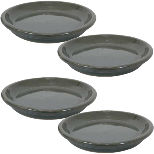 Round indoor/outdoor garden planter saucers. Durable glazed ceramic construction. Includes 4 saucers. UV and Frost Resistant. Dimensions: 11.75" outer diameter (9.25" inner diameter) x 1.75" H; 4 lbs per saucer