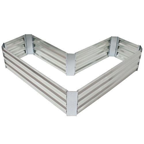 Galvanized raised garden bed. Includes 1 garden bed. Galvanized steel. Unique L-shaped corner design. Dimensions: 47.25" W x 47.25" D x 12" H; weighs 13.2 lbs; soil capacity: 67.3 gal. (8.9 cu in.)