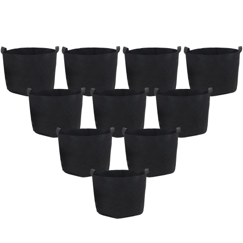 Heavy-duty garden grow bags with durable handles. Made of nonwoven 300 GSM needle punched polypropylene felt. Includes 10 grow bags. Easy to move and provides excellent drainage for healthier plants and roots. Container Dimensions: 14" Diameter x 12.5" H; Weighs 4.45 oz.