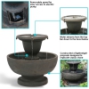 Accent any lawn or garden with this European-inspired 2-tier outdoor water fountain. The classic style of this water feature makes it an ideal decorative element for any backyard space. Made of durable polyresin, this fountain is easy to clean, durable against the elements, and remains lightweight to easily move to any location. From the top tier, water streams down to the basin below from four points. The water is circulated through the fountain via the included electric submersible JR-350 120V 0.070A 60Hz pump. Setting up this fountain is simple, with no plumbing required. Simply place in the preferred location, fill the bottom basin with water, plug into a standard electrical outlet, and watch the space transform with a beautiful focal point and soothing soundscapes. Place in the yard, garden, or other landscaping.