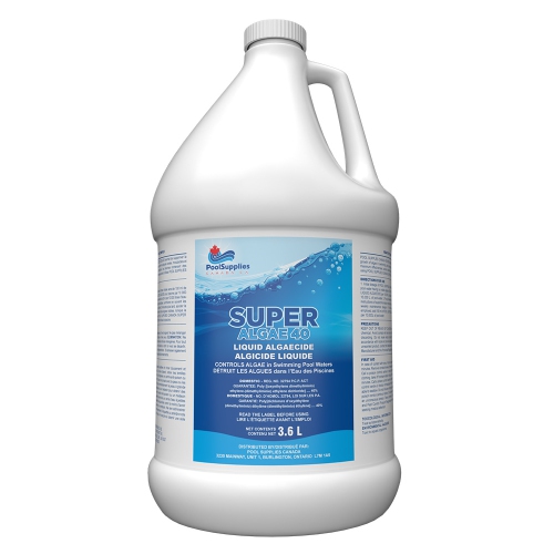 Pool Supplies Canada Super Algae 40 is a 40% concentrated, non-foaming algaecide, perfect for controlling algae in your swimming pool. Use as a weekly algae preventative or for an algae treatment if your pool has gone green.At a 40% concentrate, this product is super strong and highly effective at flocking dead algae to the pool floor after a shock treatment. This product is non-foaming and does not contain any metals.