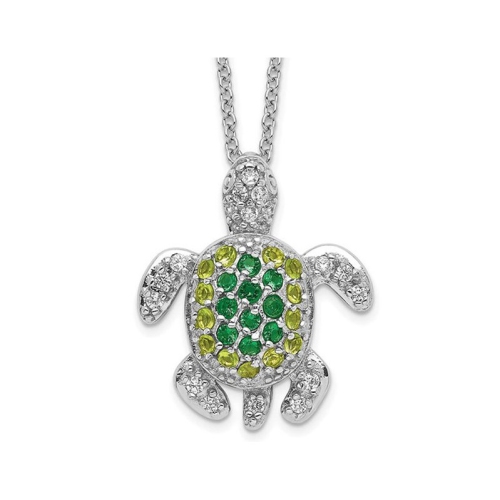 Green cubic zirconias and glass combine to adorn this sterling silver rafted turtle pendant with silver 18 inch chain included.