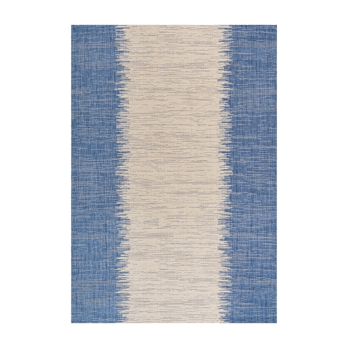 Our modern rug's denim blue border is woven with a strie effect to create a central stripe design. This versatile rug's minimalist look is perfect for a coastal cottage porch or modern outdoor patio.