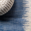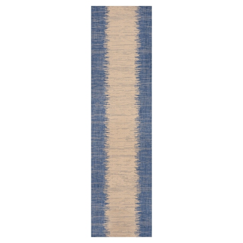 Our modern rug's denim blue border is woven with a strie effect to create a central stripe design. This versatile rug's minimalist look is perfect for a coastal cottage porch or modern outdoor patio.