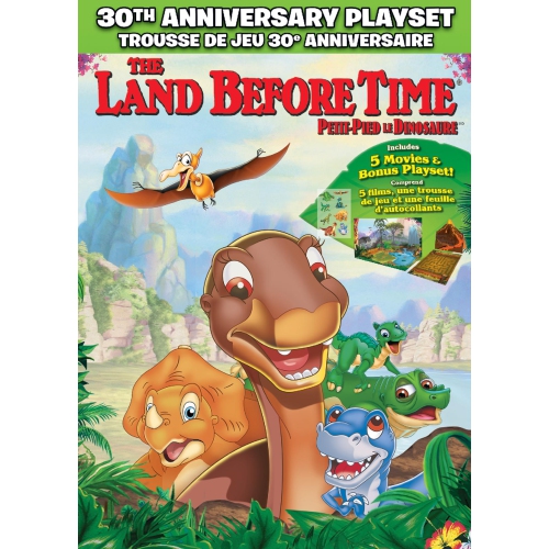 A DVD of "The Land Before Time: 30th Anniversary Playset," featuring several movies from the beloved animated series where young dinosaurs embark on adventures, learn valuable lessons, and form enduring friendships in a prehistoric world.