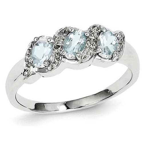 Three beautiful oval aquamarine gemstones the birthstone for March, is the centerpiece of this rhodium plated sterling silver promise ring with accent diamonds.