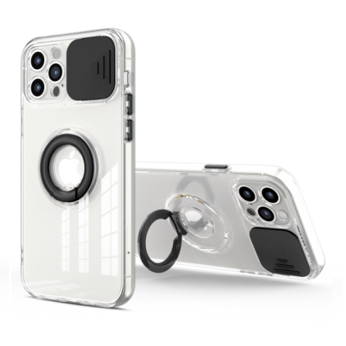TopSave Colorful Sliding Window Camera Lens Protective Clear TPU Phone Case w/ Ring Holder Stand Cover For iPhone 12 Pro Max 6.5", Black