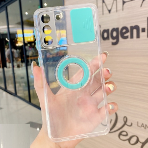 TopSave Colorful Sliding Window Camera Lens Protective Clear TPU Phone Case w/ Ring Holder Stand Cover For Samsung Galaxy S21 FE, Teal