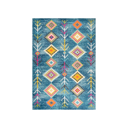 Moroccan influences abound in the colorful geometric design of this rug. Cheerful colors create a lively medallion design against a deep teal blue background. Add graphic impact to a modern room, or make this rug part of your Boho-chic story.
