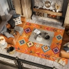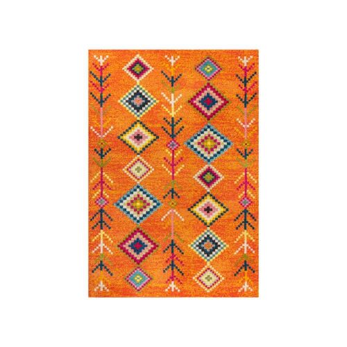 Moroccan influences abound in the colorful geometric design of this rug. Cheerful colors create a lively medallion design against a bright orange background. Add graphic impact to a modern living room, kitchen or bedroom, or make this rug part of your colorful Bohemian story.