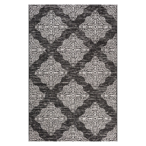 Inspired by the tile floors of Italy, this indoor/outdoor rug adds elegant pattern to your porch, patio or sunroom. Ogee-curved medallions woven in ivory add graphic punch to a deep black background.