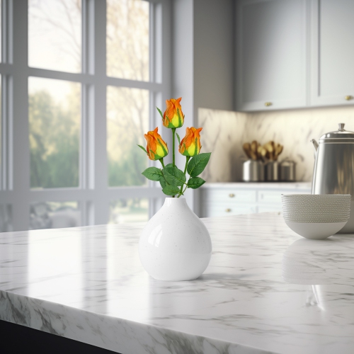 Lifelike rose bud and leaves. Bendable wire stems for easy shaping and styling. No watering or maintenance required
