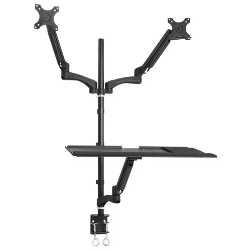 The TygerClaw 13"-27" sit-stand workstation for dual monitors has a sturdy construction and keeps your monitors and accessories safe and secure. The bracket offers easy adjustment of the monitors in both vertical and horizontal positions with its gas spring. Offering space-saving solution, this workstation has tilt and swivel functionality for comfortable viewing angles.
