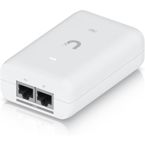 PoE+ adapter providing 30W of power with surge, peak pulse, and overcurrent protection. Includes RJ45 data input, AC cable with earth ground, and PoE+ output. Features an LED indicator for status monitoring. Compatible with Ubiquiti U7 and U6 devices.