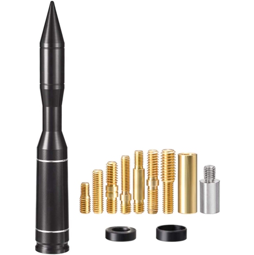 Solid Billet Aluminum Alloy Material Construction and Black Hard Anodizing that will not chip or fade; Dimensions: 5.5 inch / 14cm Length; Package list: 1 x Antenna, 9 x Different Size Screws Adapters, 2 x Rubber Rings; Easy to install, It only takes a few minutes to complete the antenna installation. Simply unscrew and remove the old antenna from the car or pickup trucks, then select the appropriate screws for the car antenna mount and install the antenna; Car Wash Safe, It is short and solidly built, only 5.5 inch long, can withstand auto car washing, and will not be easily bent or damaged;