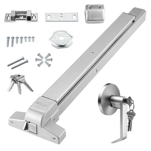 The panic bar is made from rugged 304 stainless steel, ensuring durability and resistance to rust and corrosion. The high-hardness lock tongue prevents unauthorized access. The dogging key feature allows constant access. The zinc alloy exterior handle and copper lock core ensure longevity.