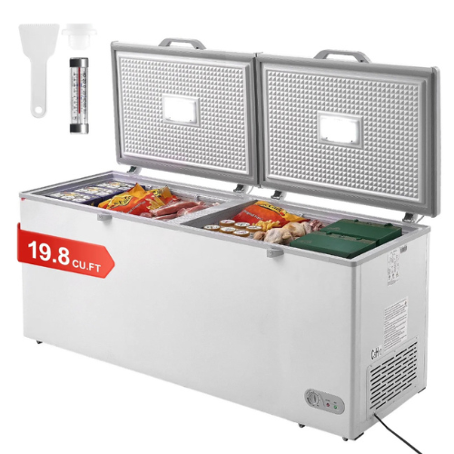 The VEVOR 19.8 Cu.Ft. chest freezer features 4 baskets, adjustable thermostat (-28 to 10.4 °C), dual lockable lids, balanced hinge doors, LED lighting, 6 casters, and high-efficiency compressor—ideal for home, restaurant, or commercial use.