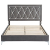 Dimensions of fully assembled product L x W x H:86.75 x 66 x 60.Modern platform bed; no box spring required.Velvet upholstery with mirrored acrylic quatrefoil pattern on headboard.Headboard with adjustable legs to accommodate various mattress heights.Chrome-finished legs on footboard.12 pcs roll slat system with support legs; approximate weight capacity is 500 lbs.