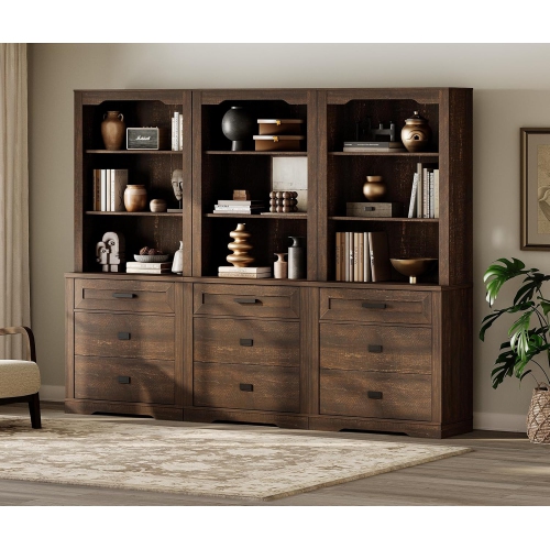 WAMPAT 3 Tier Bookcase with 9 Drawers, Three-column 73.3" Tall Farmhouse Library Bookshelf with 9 Open Shelves for Bedroom, Living Room & Home Office, Brown