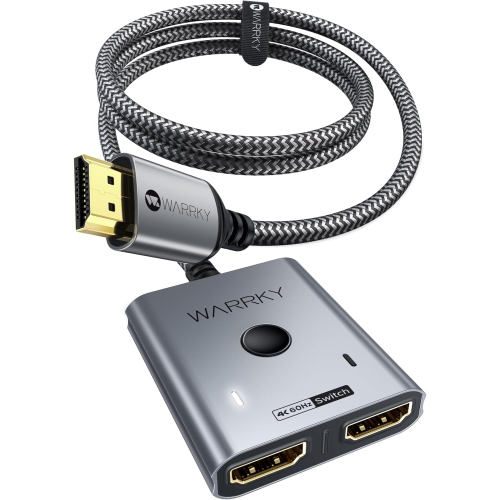 The WARRKY HDMI Switch allows you to switch between two HDMI sources or displays with 4K at 60Hz resolution. Featuring an aluminum case and a fixed braided cable, this switcher is compatible with PS5, Xbox, Roku, and other devices.