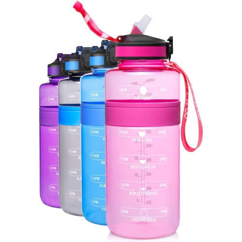 Water Bottle with Straw BPA Free, 64oz Tritan Drinking Bottles with Time Marker, Half Gallon Leakproof Sports
