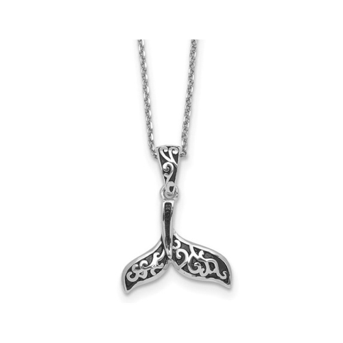 A classic charm whale pendant from antiqued sterling silver hangs from a sleek sterling silver 18 inch chain. This whale pendant necklace weighs 3.00 grams and is 3/4 inch in length.