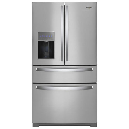 The Whirlpool 36-inch French door refrigerator keeps your food fresh and easily accessible. This fridge has triple-tier freezer storage with two upper sliding drawers and a lower bin to store your frozen items. You can easily access filtered water and ice anytime, thanks to the external water and ice dispenser. Four-door design enhances the overall look of your kitchen.