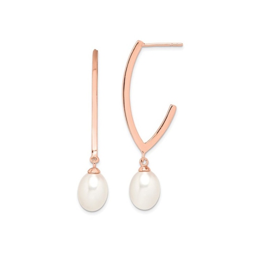 Classic drop dangle geometric fashion earrings from rose plated sterling silver featuring white freshwater cultured 8-9mm rice white pearls. This dangle earrings offer style at the right price.