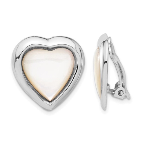 Two beautiful white heart shaped mother of pearls are bezel-set in polished sterling silver creating classic button earrings with omega clip backings. These earrings can be worn on non-pierced ears.