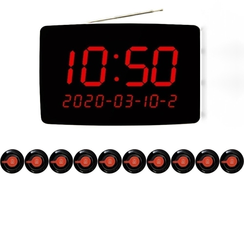 10Pcs Call Buttons: This wireless calling system set provides 10pcs waterproof call buttons, 1 PC display receiver, 10pcs x sticker, and 1 adapter.Wide Application: This wireless calling system is perfect for restaurant, nursing home, cafe, supermarket, hotel, hospital ward, emergency center, bank, school, factory, construction site.