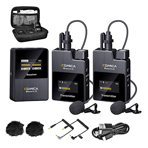 BoomX-D2 2.4G Digital 1-Trigger-2 Wireless Microphone. Widely Applied to Conference,Speech, Web Podcast,YouTube, Google , Outdoor Live, Video Recording, Conference, Vlogging, Church, Interview, Teaching, ASMR Etc. Compatible for IPhone 6, 6s, 8, 7, 11, 11Pro, XR, Sony, Samsung Phone, Sony, Android phone, 1 Phone,Canon,Nikon,Sony,Panasonic DSLR Cameras Etc. Main Features: . 2.4G Digital Wireless, Global Free Frequency . Dual Transmitters Triggered by One Receiver . Visual Po