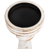 Spindle-style wide base pillar candle holder. Anrique brushed white finish for a weathered look. For use with real wax or LED candles; for indoor use