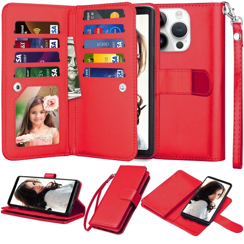 XCRS Apple iPhone 14 Pro Max Wallet Pouch Case, detachable magnet phone cover, Store 9 cards, PU Leather Flip Cover with Kickstand Magnetic Closure Folio Case with Lanyard.