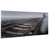 Yosemite Home Decor presents a gorgeous, gloomy depiction of train tracks with a locomotive in the distance. The perspective is unique because the viewer's eye is immediately drawn to the close up of the tracks. The 3D effect is eye catching. The rocks and pebbles between the spurs are raised off of the canvas.Features : Material: WoodFinish: GrayThis wall art is gallery wrapped which achieves the elevated gallery inspired aes...