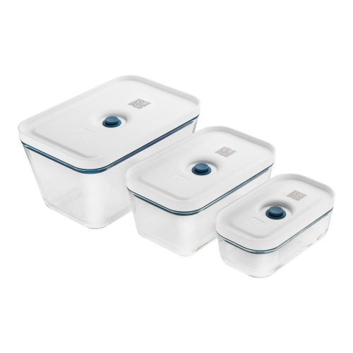 The elegantly shaped containers that deliver more freshness to your kitchen: The three glass boxes from ZWILLING FRESH & SAVE help you keep your food fresh up to five times longer compared to conventional storage without vacuum-sealing. So you can prepare food at your convenience the day before and enjoy it later, just as fresh and full of flavor. At the same time, thanks to the color accents in the modern La Mer shade of blue, the boxes also look really good – they can even be used to serve food at the table. In addition, the vacuum containers impress with lots of other advantages. Firstly, with their high-quality material: The borosilicate glass is very robust and makes the boxes real all-rounders in the kitchen. They can be stored in the freezer, heated in the microwave and oven (up to 180°C) and are also dishwasher-safe. Practical too: After use, you can stack the three vacuum containers inside each other to save space when storing them.