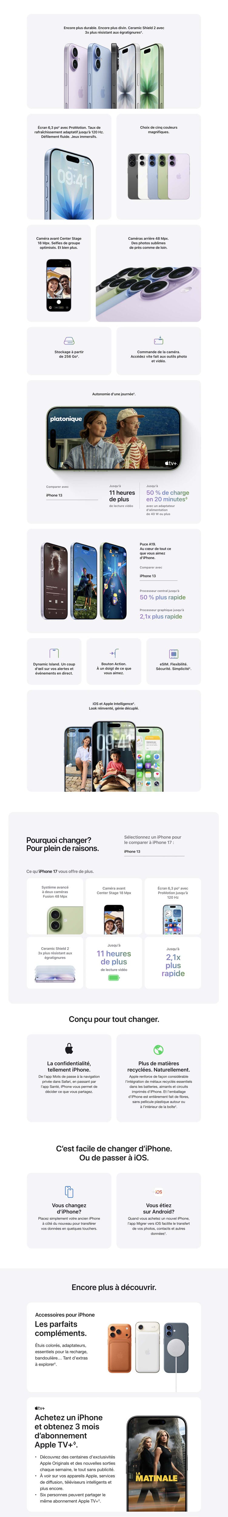 Alimentation et autonomie : Tous les chiffres avancés en matière d’autonomie dépendent de la configuration réseau et de nombreux autres facteurs; les résultats réels varient. La batterie a un nombre limité de cycles de charge et il peut être nécessaire, à terme, de la faire remplacer. L’autonomie et le nombre de cycles de charge varient en fonction de l’utilisation et des réglages. Pour en savoir plus, consultez apple.com/ca/fr/batteries et apple.com/ca/fr/iphone/battery.html.