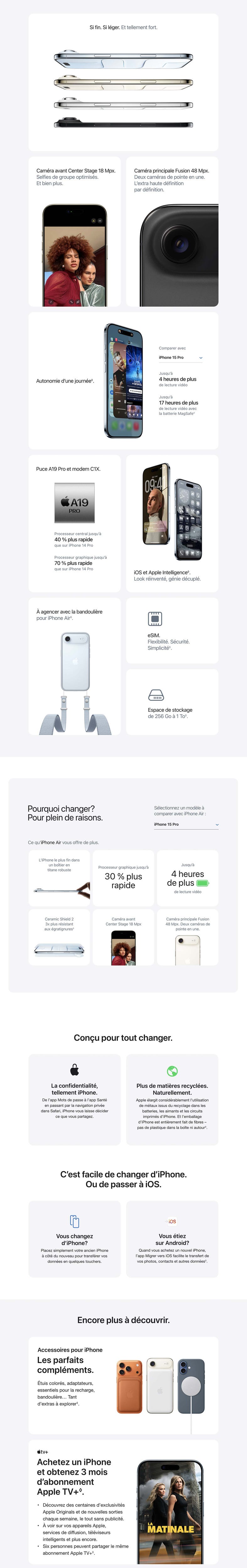 eSIM : Les modèles d’iPhone 17 et iPhone Air sont activés par eSIM et ne prennent pas en charge les cartes SIM physiques. Pour utiliser une eSIM, vous devez souscrire un forfait de services sans fil auprès d’un fournisseur qui prend en charge cette technologie. Consultez votre fournisseur pour les détails. Pour en savoir plus, consultez apple.com/ca/fr/esim.