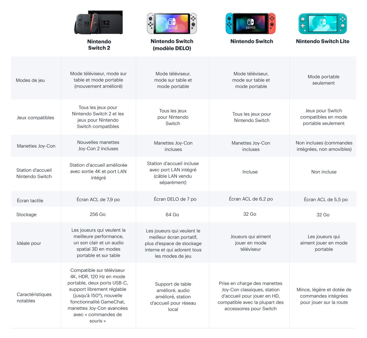 *La Nintendo Switch (modèle DELO) est compatible avec la bibliothèque complète de jeux pour Nintendo Switch. Cependant, il peut y avoir des jeux pour lesquels l’expérience peut être différente en raison des nouvelles capacités de la console, comme la taille plus grande de l’écran.