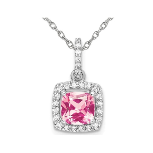 Une pierre précieuse coupée à coussin tourmaline rose rose se déroule dans l'or blanc de 14 karat en frappant tandis que les diamants étimulants ajoutent un peu d'éclat supplémentaire dans une formation de halo à ce mignon pendentif. Ce pendentif classique de pierre précieuse rose comprend une chaîne en or de 18 pouces.