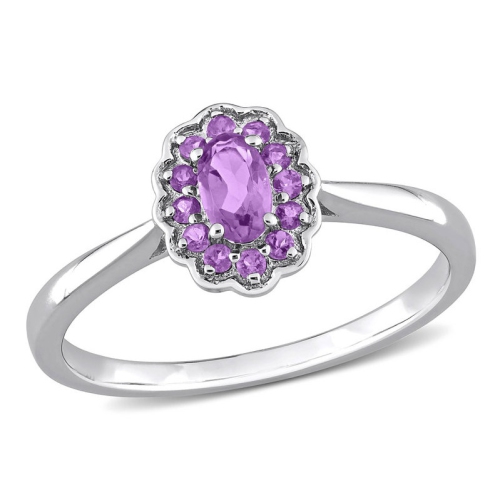 Élégant et élégant, cette bague de promesse de halo chic est la pièce parfaite pour la faire croire en votre engagement éternel. Fabriqué en argent sterling lustré, cette bague exquise dispose d'une pierre précieuse d'améthyste coupée et d'améthyste d'améthyste au centre avec 12 gémons d'améthyste africains de 12 pavé rondes placés dans une conception de halo. Poli à une brillance brillante, cette