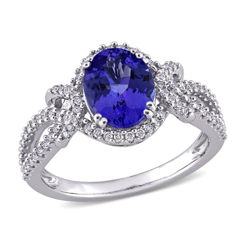 This extraordinary twist engagement ring is crafted in crisp 14 karat white gold, and features an oval-cut tanzanite center stone surrounded by shimmering white diamonds 1/3 carat (ctw)