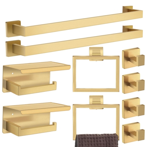 10 Pieces Stainless Steel Brushed Gold Bathroom Hardware Set Includes 23.6 Inch Towel Bar, Toilet Paper Holder, Towel Ring, Robe Hook, Wall Mounted