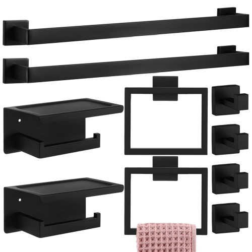 10 Pieces Stainless Steel Matte Black Bathroom Hardware Set Includes 23.6 Inch Towel Bar, Toilet Paper Holder, Towel Ring, Robe Hook, Wall Mounted