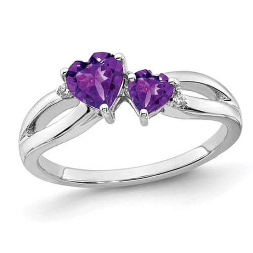 Bague de cœur de promesse simple et élégante dotée d'une gémasse d'améthyste à deux cardiaques de 965 carats (CTW) dans une fondation d'or blanc chatoyante de 10 karat. Cette bague de promesse à double coeur présente la pierre de naissance du mois de février.