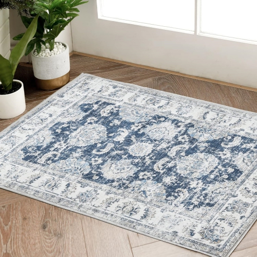 2 x 3 Area Rug - Entryway Rug Washable Rug Vintage Floral Print Doormat Distressed Dark Blue Rug Low Pile Rug Non Slip Rug Thin Kitchen Rug Floor Cover Small Throw Rug for Entryway