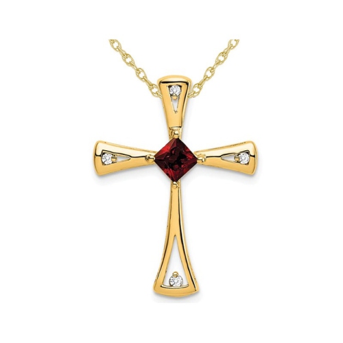 Cette pendentif croix chaud et rayonnante, pendentif 3/10 carat (CTW) présente une pierre précieuse de grenat de princesse coupée dans une base en or jaune brillant à 14 karat. Ce pendentif mettant en vedette la pierre de naissance de janvier avec une chaîne d'or de 18 pouces 14K.